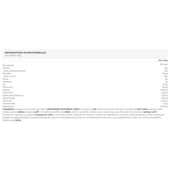Ingrediënten : kokosschaafsel (28%)(SULPHUR ANHYDRIDE(E220)), melkchocolade (20%) (suiker, cacaoboter, volle MELKpoeder, cacaomassa, watervrij melkvet (MELK), emulgator (SOYA lecithine), natuurlijk vanille aroma), suiker, glucosestroop, oplosbare maïsvezels, lactose(MELK), bevochtigingsmiddel (glycerol), weipoeder(MELK), L-carnitine (0,31%), vitaminen en mineralen (geconcentreerd magnesiumcitraat, ascorbinezuur, nicotinezuur, dl-alfa-tocoferolacetaat, calciumd-panthothenaat, pyridoxinehydrochloride, thiaminemononitraat, cyanocobalamine), zeezout, aroma, emulgator ( sojalecithine).