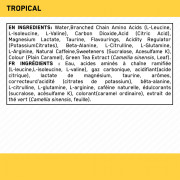Tropischeingrediënten: water, vertakte-keten aminozuren (L-Leucine, L-Isoleucine, L-Valine), kooldioxide, zuur (citroenzuur), magnesiumlactaat, taurine, aroma's, zuurteregelaar (kaliumcitraten), beta-alanine, L-Citrulline, L-Glutamine, L-Arginine, L-tyrosine, natuurlijke cafeïne, zoetstoffen (sucralose, acesulfaam-K), kleurstof (karamel), groene thee-extract (camellia sinensis, blad).