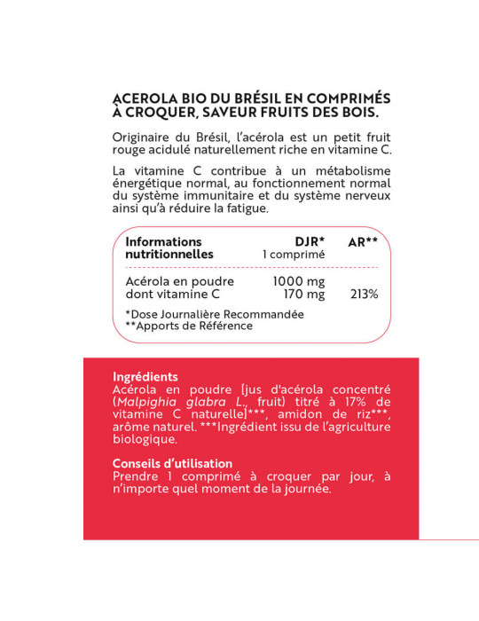 Acerola is een kleine, wrange rode vrucht die van nature rijk is aan vitamine C. 1 biologische Acerola tablet (60 capsules) bevat 1000mg acerola, inclusief 170mg vitamine C.