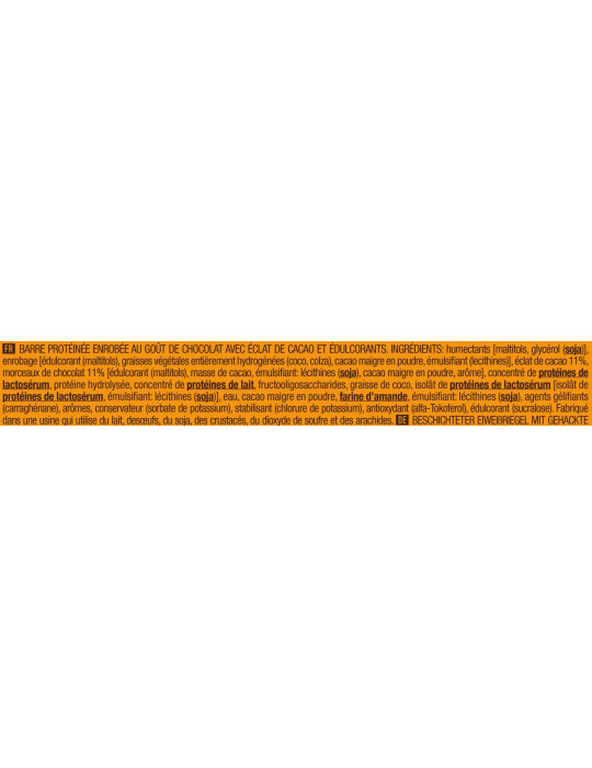 [édulcorant (maltitols), graisses végétales entièrement hydrogénées (coco, colza), cacao maigre en poudre, émulsifiant (lecithines)]Ingrediënten: bevochtigingsmiddelen [maltitolen, glycerol(soja)], coating , cacaonib 11%, chocoladestukjes 11% [zoetstof (maltitolen), cacaomassa, emulgator: lecithinen(soja), mager cacaopoeder, aroma], wei-eiwitconcentraat, gehydrolyseerd eiwit, melkeiwitconcentraat, fructooligosachariden, kokosvet, wei-eiwitisolaat [wei-eiwitisolaat, emulgator: lecithinen(soja)], water, mager cacaopoeder, amandelmeel, emulgator: lecithinen(soja), geleermiddel (carrageen), aroma's, conserveermiddel (kaliumsorbaat), stabilisator (kaliumchloride), antioxidant (alfa-Tokoferol), zoetstof (sucralose).