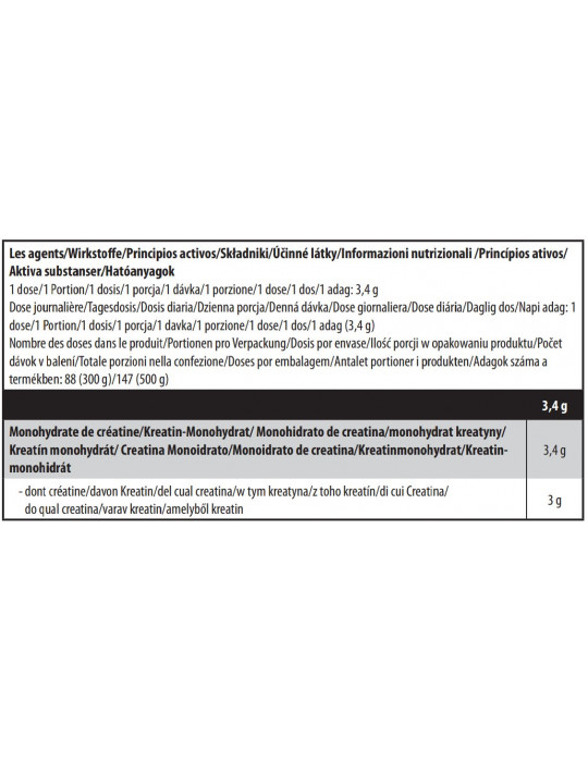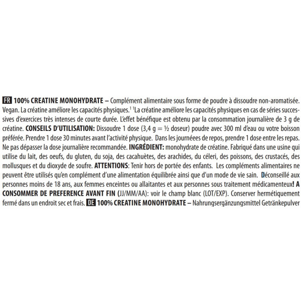 Nettogewicht : 300 gNeem 3,4 g of 1/2 schep 100% Creatine per dag verdund in 300 ml vloeistof 30 minuten voor de fysieke activiteit. Neem op rustdagen 1 dosis tussen de maaltijden.