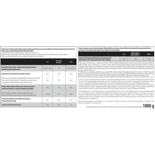 Ingrediënten Hazelnoot en Walnoot: Pisane® C9 erwteneiwit, aroma's, rijsteiwit, zout, kokosnooteiwit, granaatappeleiwit, pompoeneiwit, verdikkingsmiddel (xanthaangom), zoetstoffen (sucralose, acesulfaam K), kleurstof (ammoniakale karamel), cyanocobalamine.