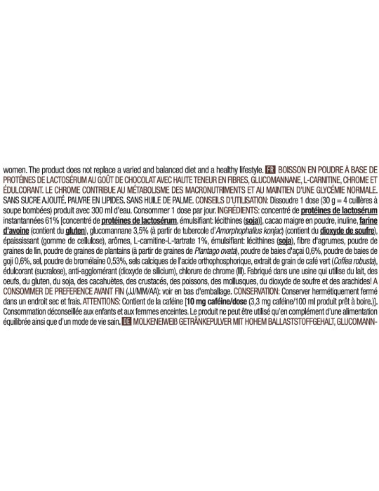 Ingrediënten Chocolade : eiwitconcentraat wei instant 61% [eiwitconcentraat uit wei, emulgator: lecithinen (soja)], magere cacaopoeder, inuline, havermout (bevat gluten), glucomannaan 3,5% (uit Amorphophallus konjac knol) (bevat zwaveldioxide), verdikkingsmiddel (cellulosegom), aroma's, L-carnitine-L-tartraat 1%, emulgator: lecithinen (soja), citrusvezels, lijnzaadpoeder, weegbreezaadpoeder (van Plantago ovata zaden), acaibessenpoeder 0,6%, gojibessenpoeder 0,6%, zout, bromelaïnepoeder 0,53%, calciumzouten van orthofosforzuur, extract van groene koffiebonen (Coffea robusta), zoetstof (sucralose), antiklontermiddel (siliciumdioxide), chroom(III)chloride.