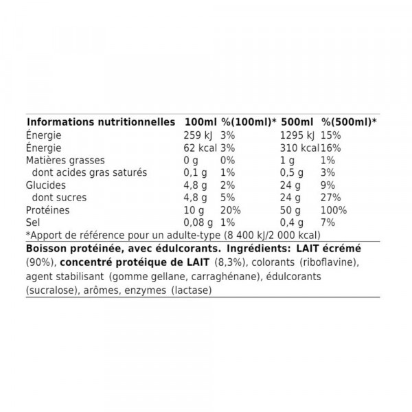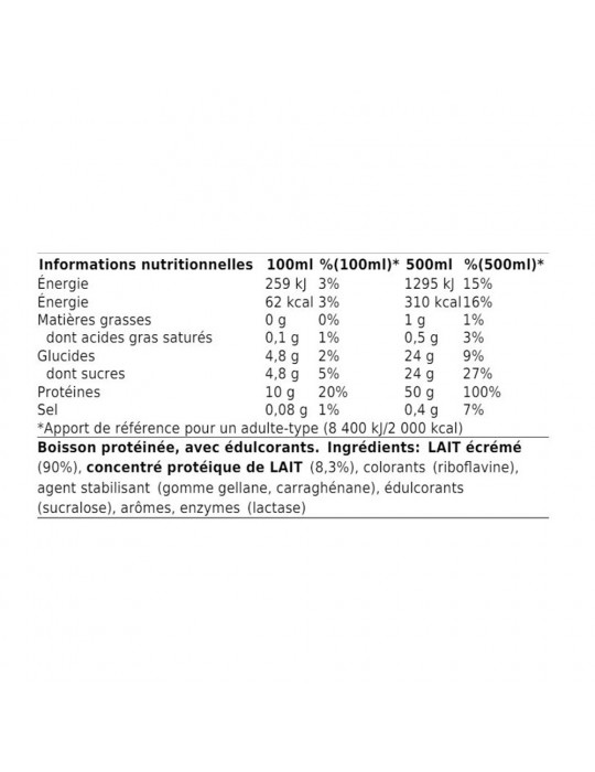 Deze eiwitshake heeft het voordeel dat hij 50 g eiwitten per portie bevat en weinig suikers bevat (4,8%). Het is daarom een perfecte aanvulling op een uitgebalanceerd dieet of op een eiwitrijk of afslankdieet. Het is ook lactosevrij, dus het is super licht verteerbaar, zelfs voor mensen die lactose-intolerant zijn!