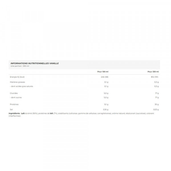 Eén fles bevat 30g proteïne van hoge kwaliteit met slechts 0,3g vet en geen toegevoegde suiker. En dat alles voorminder dan 200 kcal .