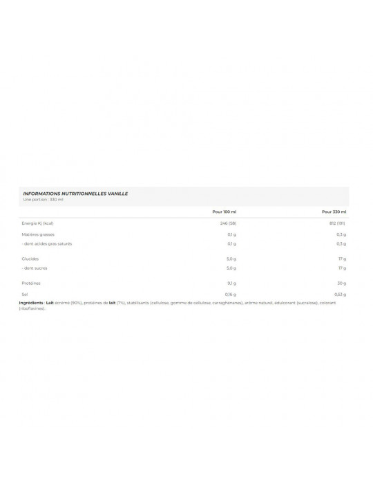Vanille-ingrediënten: Magere melk (90%), melkeiwit (7%), stabilisatoren (cellulose, cellulosegom, carrageen), natuurlijk aroma, zoetstof (sucralose), kleurstof (riboflavinen).