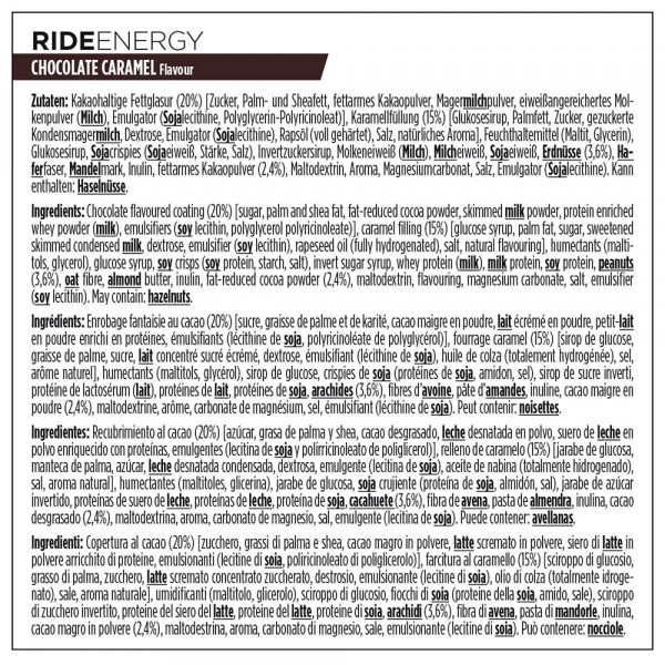 Ingrediënten Choco Caramel: cacao gearomatiseerde coating (20%) [suiker, palmvet, sheaboter vet, magere cacaopoeder, magere melkpoeder , eiwitverrijkt weipoeder , emulgator (sojalecithine, polyglycerol polyricinoleaat)), karamelvulling (15%) [glucosestroop, palmvet, suiker, gezoete gecondenseerde magere melk , dextrose, emulgator (sojalecithine), raapzaadolie (volledig gehydrogeneerd), zout, natuurlijk aroma], bevochtigingsmiddel (maltitol, glycerol), glucosestroop, krokante sojastukjes (soja-eiwit, zetmeel, zout), invertsuikerstroop, wei-eiwit (melk), melkeiwit, soja-eiwit, pinda's (3,6%), havervezels, amandelspijs, inuline, magere cacaopoeder (2,4%), maltodextrine, aroma's, magnesiumcarbonaat, zout, emulgator (sojalecithine).