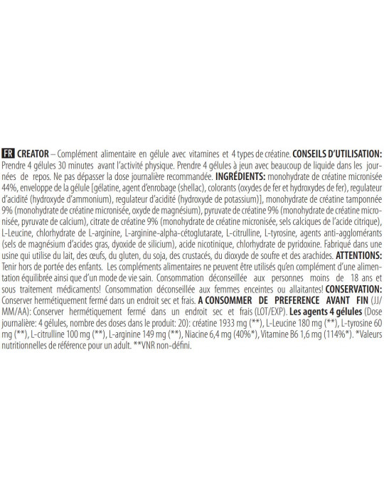 Creator is een veelzijdige creatineformule die gemakkelijk wordt opgenomen. Eén portie bevat 1933 mg van 4 verschillende creatines (gemicroniseerd creatinemonohydraat, gebufferd creatinemonohydraat, creatinepyruvaat en creatinecitraat). Creatine is het voedingssupplement dat het meest gebruikt wordt door liefhebbers van fitness en bodybuilding om maximale kracht en volume op te bouwen.