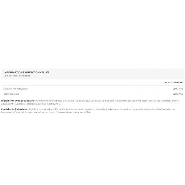 Ingrediënten Bloedsinaasappel: Creatinemonohydraat 31%, zuur (citroenzuur), zuurteregelaar (natriumcarbonaten), vulstof (sorbitol), aroma, zoetstof (sucralose), kleurstoffen (karmijn, riboflavinen).