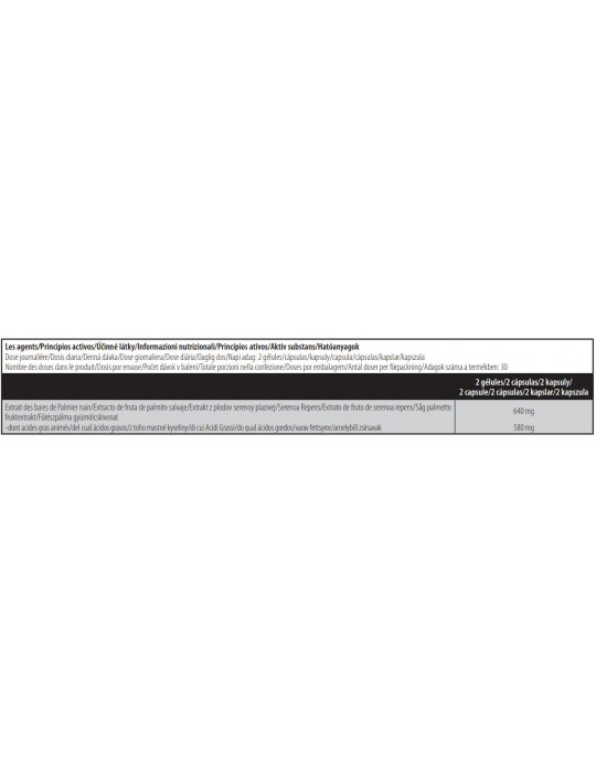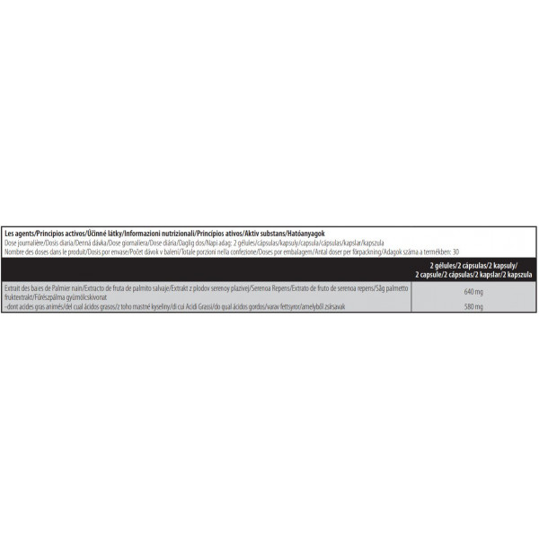 Dit voedingssupplement in capsulevorm (gewicht: 0,92 g) bevat voornamelijk zaagpalmextract ( 640 mg per portie). Zaagpalm, ook bekend als Sabal of saw palmetto, wordt gebruikt om de hormoonproductie te optimaliseren. Meer in het algemeen wordt het gebruikt om prostaathypertrofie te verlichten.
