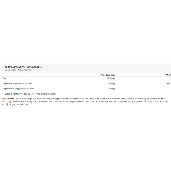 Zink (12,5 g) is een essentieel mineraal dat het lichaam niet kan aanmaken of opslaan. Het heeft talrijke voordelen voor het goed functioneren van het lichaam. Het draagt bij aan een normale eiwitsynthese en de normale werking van het immuunsysteem. Zink speelt ook een rol bij de bescherming van cellen tegen oxidatieve stress en bevordert een mooie huid .