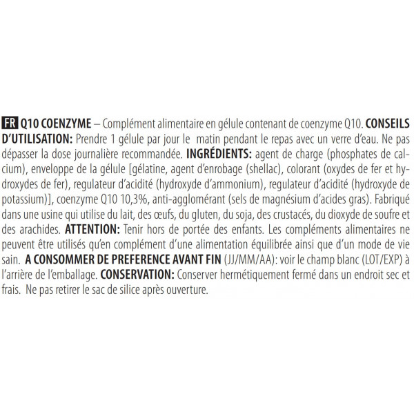 Ingrediënten: [gélatine, agent d’enrobage (shellac), colorant (oxydes de fer et hydroxydes de fer), régulateur d’acidité (hydroxyde d’ammonium), régulateur d’acidité (hydroxyde de potassium)] Vulstof (calciumfosfaten), capsulehuls, co-enzym Q10 10,3%, antiklontermiddel (magnesiumzouten van vetzuren).