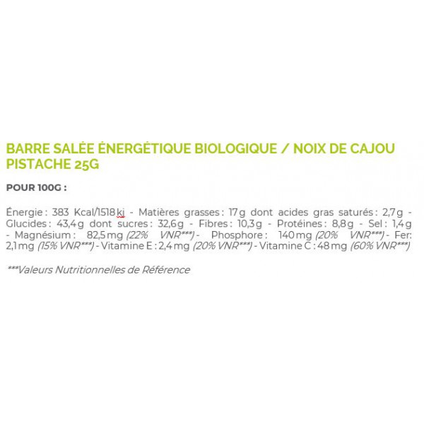 De reep met cashewnoten- en pistachenotensmaak is een hartige reep die helpt bij het compenseren van mineraalverlies. Het hoge koolhydraatgehalte in combinatie met BCAA's (Isoleucine, Leucine, Valine) helpt spiervermoeidheid te verminderen. Het is ook rijk aan natuurlijke vitamine C (48 mg*) en spirulina om oxidatieve stress te bestrijden. Van spirulina wordt ook gedacht dat het bijdraagt aan het spiermetabolisme en de circulatie van zuurstof in het bloed bevordert. Tot slot bevat de zoutstaaf mineralen zoals magnesium (82,5 mg*), fosfor (175 mg*) en ijzer (2,1 mg*). Allemaal essentieel voor een goede werking van het lichaam!