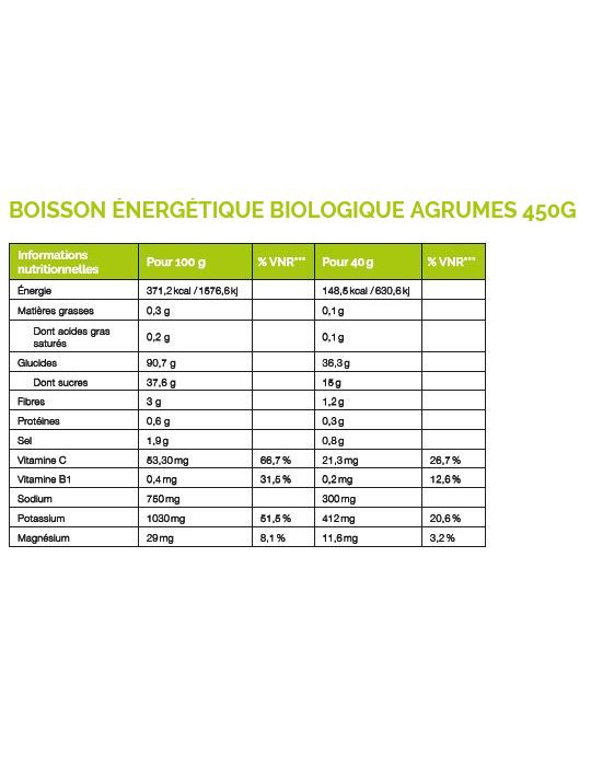 Ingrediënten - Citrussmaak : gedehydrateerde maniokstroop D.E 10(1), kokosbloesemsuiker(1), natuurlijk sinaasappelaroma, natuurlijk citroenaroma met andere natuurlijke aroma's, zout, acerola-extract getitreerd tot 17% vitamine C(1). (1)Ingrediënten van biologische landbouw