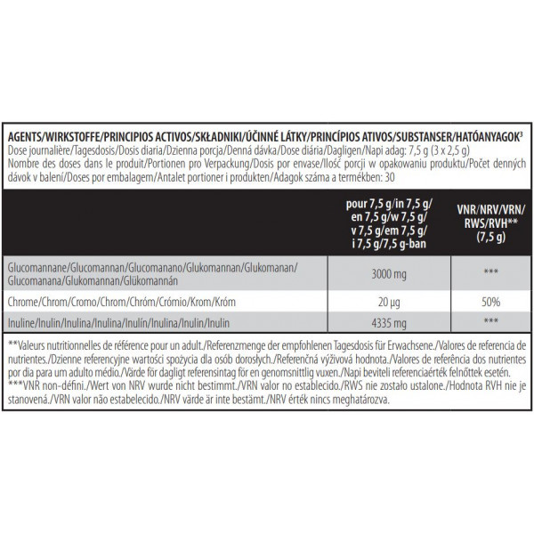 Ingrediënten: Inuline 58%, glucomannaan 42% (uit Amorphophallus konjac knol)(zwaveldioxide), antiklontermiddel (siliciumdioxide), chroompicolinaat (III).