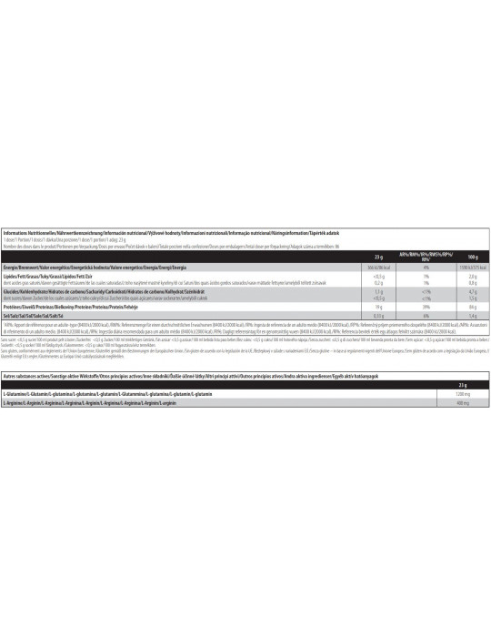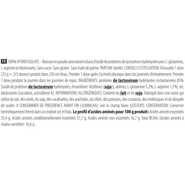 Vanille ingrediënten: instant gehydrolyseerd wei-eiwit 85% [gehydrolyseerd wei-eiwitisolaat, emulgator: lecithine(soja)], aroma's, L-glutamine 5,2%, L-arginine 1,7%, zout, zoetstoffen (sucralose, acesulfaam K)