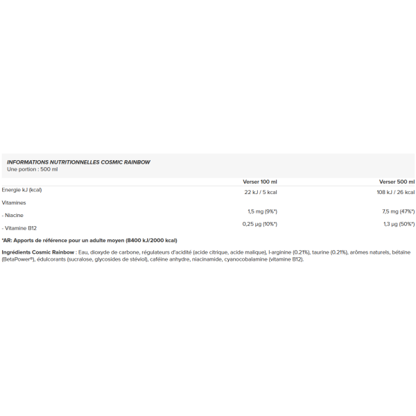 Grondstoffen Kosmische Regenboog eau, dioxyde de carbone, régulateurs d'acidité (acide citrique, acide malique), l-arginine (0,21%), taurine (0,21%), natuurlijke arômes, bétaïne (BetaPower®), stimulerende middelen (sucralose, glycosiden de stéviol), caféine anhydre, niacinamide, cyanocobalamine (vitamine B12).
