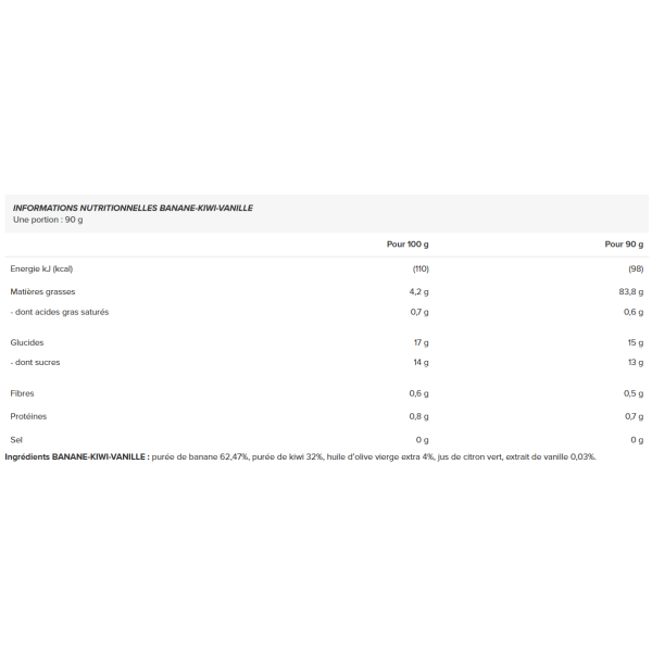 Ingrediënten BANANA-KIWI-VANILLA: bananenpuree 62,47%, kiwipuree 32%, extra vierge olijfolie 4%, limoensap, vanille-extract 0,03%.