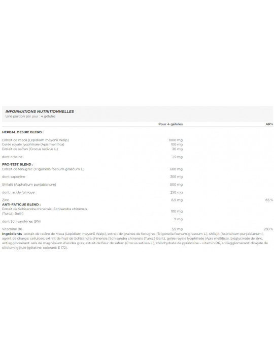 Ingrediënten: Macawortelextract (Lepidium meyenii Walp.), fenegriekzaadextract (Trigonella foenum-graecum L.), shilajit (Asphaltum punjabianum), vulstof: cellulose; Schisandra chinensis-vruchtenextract (Schisandra chinensis (Turcz.) Baill.), gevriesdroogde koninginnengelei (Apis mellifica), zinkbisglycinaat, antiklontermiddel: magnesiumzouten van vetzuren; saffraanbloemextract (Crocus sativus L.), pyridoxine hydrochloride - vitamine B6, antiklontermiddel: siliciumdioxide; capsule (gelatine, kleurstof: E 172).