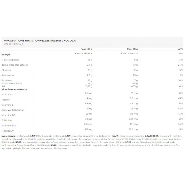 Ingrediënten - ChocoladesmaakEiwitten MELK (31%) (eiwitisolaat uit MELK, eiwitconcentraat wei (MELK)), oplosbare maïsvezels, ARACHIDES, zoetstof (maltitol, sucralose, steviolglycosiden), plantaardige vetten (ongeharde palmolie, sheaboter), chocolade (3,5%) (zoetstof (maltitol), cacaomassa, emulgator (cacaolecithine)) SOJA), magere cacaopoeder, natuurlijk vanillearoma), bevochtigingsmiddel (glycerol), eiwitisolaat uit SOJA, cacao, oplosbare acacia vezels, tapiocazetmeel, zout, aroma's, emulgator (kaliumlecithine) SOJA), vitaminen en mineralen (magnesiumzouten van citroenzuur, ascorbinezuur, nicotinezuur, DL-alfa-tocoferylacetaat, D-calciumpantothenaat, pyridoxinehydrochloride, thiaminemononitraat, cyanocobalamine).