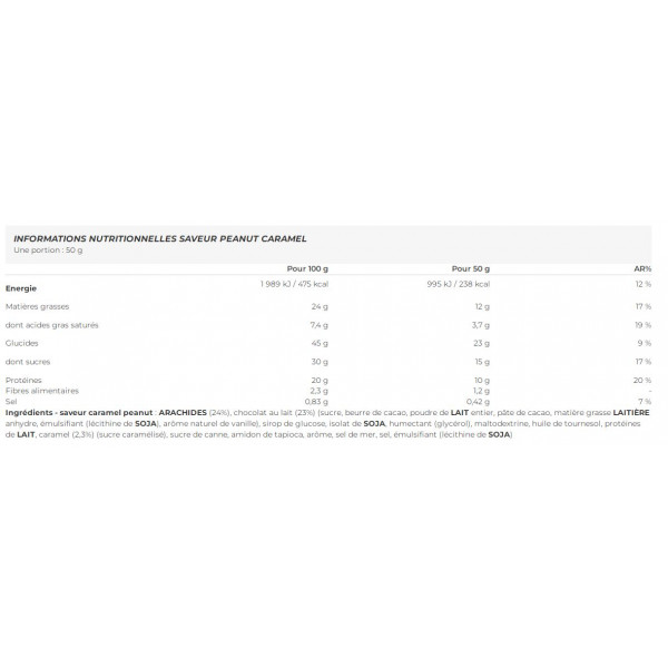 Ingrediënten - karamel-pindasmaak: ARACHIDEN (24%), MELKchocolade (23%) (suiker, cacaoboter, volle MELKpoeder, cacaomassa, watervrij MELKvet, emulgator (SOYA lecithine), natuurlijk vanille aroma), glucosestroop, sOYA-isolaat, bevochtigingsmiddel (glycerol), maltodextrine, zonnebloemolie, MELK-eiwit, karamel (2,3%) (gekarameliseerde suiker), rietsuiker, tapiocazetmeel, aroma, zeezout, zout, emulgator ( SOYA-lecithine)