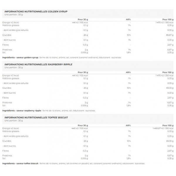Ingrediënten - gouden siroop smaakWitte rijstbloem, aroma, zout, kleurstof (karamel), zoetstof: sucralose.