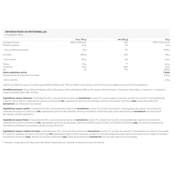Ingrediënten vanillesmaak: maltodextrine 54%, wei-eiwitconcentraat, inuline 7%, maïszetmeel 5%, gemicroniseerd creatinemonohydraat 5%, calciumcaseïnaat (bevat melk), verdikkingsmiddel (cellulosegom), aroma's, emulgator: lecithinen (soja), wei-eiwitisolaat, zout, zoetstof (sucralose), kleurstof (tartrazin)¹.