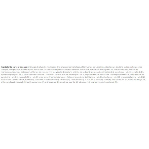 Ingrediënten - ananassmaak: koolhydratenmix (maltodextrine, glucose, isomaltulose), L-argininehydrochloride, zuurteregelaars (appelzuur, citroenzuur), minerale bestanddelen (calciumzouten van orthofosforzuur, calciumcarbonaat, magnesiumcarbonaat, ijzerhoudend fumaraat, mangaansulfaat, kaliumjodide, chroom(III)chloride, natriummolybdaat, natriumseleniet), aroma's, vitaminen (L-ascorbinezuur - vit. C, DL-alfa-tocoferylacetaat - vit. E, nicotinamide - niacine, D-biotine - biotine, retinylacetaat - vit. A, D-calcium pantothenaat - pantotheenzuur, pyridoxine hydrochloride - vit. B6, cholecalciferol - vit. D, pteroylmonoglutaminezuur - foliumzuur, thiaminemononitraat - vit. B1, riboflavine - vit. B2, cyanocobalamine - vit. B12), zoetstoffen (acesulfaam-K, sucralose), kleurstoffen : carotenoïden (A), karmijn (B), riboflavinen (C), E 150c (D), E 150d (E), E 133 (F), patentblauw V (G), indigokarmijn (H), chlorofylen en chlorofyllijnen (I), curcumine (J), anthocyanen (K), paprika-extract (L), betanine (M), medicinale plantenkool (N).