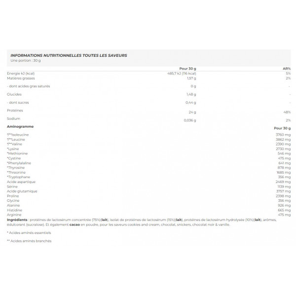 Dit eiwit is een formule gemaakt met drie verschillende eiwitbronnen: geconcentreerde wei, wei-isolaat en gehydrolyseerde wei. Deze samenstelling maakt het mogelijk om verschillende eiwitbronnen met verschillende assimilaties te hebben. Een portie van 30 gram bevat 24 gram eiwit. Eiwitten helpen de spiermassa te behouden en te vergroten.