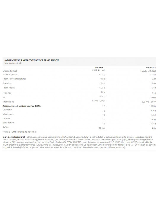 Voedingsstoffen ReferentiewaardenIngredienten Vruchtenpunch: [lécithines (soja)] 60,6% BCAA vertakte-keten aminozuren (30,3% L-Leucine, 15,15M L-Valine, 15,15% L-Isoleucine), 15,15% bèta-alanine, zuurteregelaar (citroenzuur), aroma's, verdikkingsmiddel (Arabische gom), 2,3% cafeïne, zoetstoffen (acesulfaam-K, sucralose), emulgator , pyridoxinehydrochloride (vitamine B6), kleurstoffen : carotenoïden (A), karmijn (B), riboflavinen (C), E 150c (D), E 150d (voor explosieve colasmaak)(E), E 133 (F), patentblauw V (G), indigokarmijn (H), chlorofylen en chlorofyllijnen (I), curcumine (J), anthocyanen (K), paprika-extract (L), betanine (M), medicinale houtskool (N). (A)-(Z) - Afhankelijk van de smaak van het product staat de (A-Z) code van het gebruikte bestanddeel naast de datum van minimale houdbaarheid (ten minste houdbaar tot).