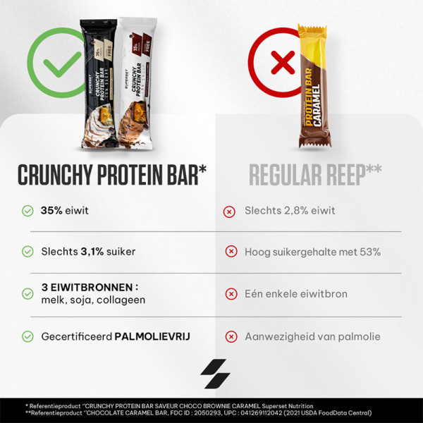 Ingrediënten Choco Brownie Karamel : volle melkchocolade met zoetstof (zoetstof (maltitol), cacaoboter, volle melkpoeder, cacaomassa, emulgator (lecithine), natuurlijk bourbon vanille aroma) 26,7%, melkeiwit(wei-isolaat, calciumcaseïnaat ), vulling met karamelsmaak (vulstof (polydextrose), zoetstof (maltitol), ongehard plantaardig vet (kokosolie, sheaboter), cacaoboter, kleurstof (appel- en hibiscusconcentraat), emulgator (lecithine), zout, natuurlijk aroma) 12,5%, bevochtigingsmiddel (glycerol), melkeiwit (melkeiwit, melkeiwithydrolysaat), soja-eiwit crispies (soja-eiwitisolaat, cacaopoeder, tapiocazetmeel) 8,33%, collageenhydrolysaat (rund), water, pure chocolade met zoetstof (cacaomassa, zoetstof (maltitol), cacaoboter, emulgator (lecithine), natuurlijk bourbon vanille aroma) 2,50%, magere cacaopoeder, aroma, microkristallijne cellulose, zout.