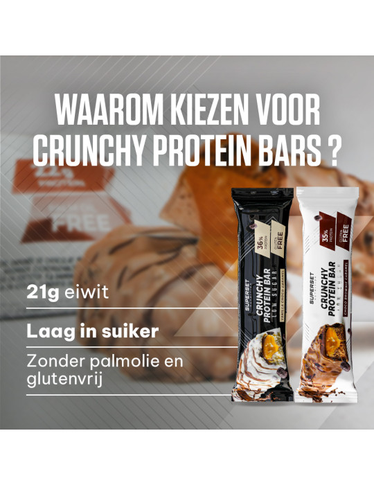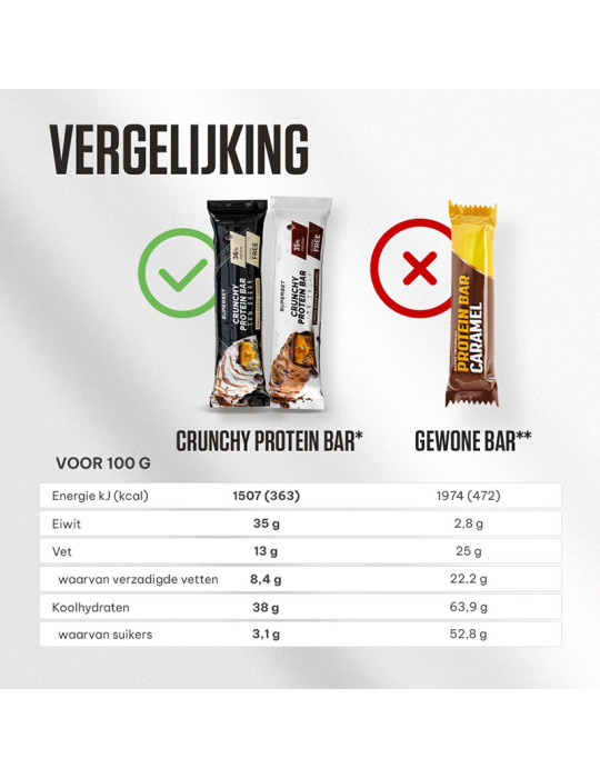 Ingrediënten Vanille Choco Karamel : witte chocolade met zoetstof (zoetstof (maltitol), cacaoboter, volle melkpoeder, emulgator (lecithine), vanilline aroma) 26,7%, karamel smaaklaag met zoetstof (vulstof (polydextrose), zoetstof (maltitol), ongeharde plantaardige vetten (kokosolie, sheaboter), cacaoboter, kleurstof (appel- en hibiscusconcentraat), emulgator (lecithine), zout, natuurlijk aroma) 12,5%, melkeiwitten (melkeiwitten, melkeiwithydrolysaat), bevochtigingsmiddel (glycerol), melkeiwit (wei-eiwitisolaat, calciumcaseïnaat ), soja-eiwit crispies (soja-eiwitisolaat, cacaopoeder, tapiocazetmeel) 8,33%, collageenhydrolysaat (rund), water, melkeiwit (calciumcaseïnaat), pure chocolade met zoetstof (cacaomassa, zoetstof (maltitol), cacaoboter, emulgator (lecithine), natuurlijk Bourbon vanille aroma) 2,50%, aroma, zout, microkristallijne cellulose.