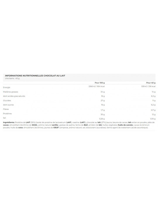 Ingrediënten: Eiwit van MELK (31%) (wei-eiwitisolaat (MELK), caseïne (MELK)), chocolade melk (27%) (suiker, cacaoboter, melk volkorenpoeder cacao, emulgator (lecithine van SOJA), natuurlijk aroma vanille), palmvet TARWE, zetmeel tarwe, plantaardige oliën (olie koolzaad), mager cacaopoeder, palmolie kokosnoot, emulgator (lecithine), dooiers van EGG camperas, natuurlijk aroma, zout, zoetstof (sucralose), verwerkingsmiddel bloem (ascorbinezuur).