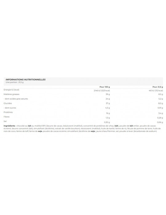 Ingrediënten: maltitol melkchocolade 81% (cacaoboter, zoetstof (maltitol), wei-eiwitconcentraat(melk), volle melkpoeder, magere cacaopoeder, geconcentreerde boter (melk), emulgator (lecithine), bourbon vanille-extract), zoetstof (maltitol), shea-olie, rijstmeel, aardappelzetmeel, kokosolie, teffmeel, sojabloem, mager cacaopoeder, emulgator (sojalecithine), scharreleigeel, zout, rijsmiddel (natriumbicarbonaat)