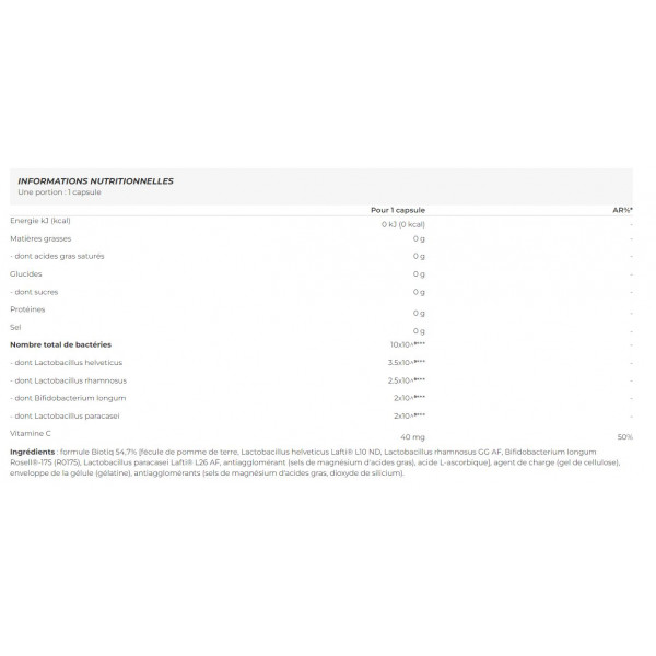 [fécule de pomme de terre, Lactobacillus helveticus Lafti® L10 ND, Lactobacillus rhamnosus GG AF, Bifidobacterium longum Rosell®-175 (R0175), Lactobacillus paracasei Lafti® L26 AF, antiagglomérant (sels de magnésium d'acides gras), acide L-ascorbique]Ingrediënten: Biotiq-formule 54,7%, vulstof (cellulosegel), capsulehuls (gelatine), antiklontermiddelen (magnesiumzouten van vetzuren, siliciumdioxide).