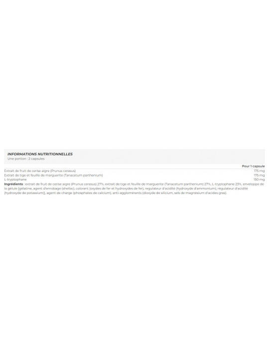 [gélatine, agent d'enrobage (shellac), colorant (oxydes de fer et hydroxydes de fer), regulateur d'acidité (hydroxyde d'ammonium), régulateur d'acidité (hydroxyde de potassium)]Ingrediënten: extract van zure kersen (Prunus cerasus) 27%, extract van madeliefjesstengel en -blad (Tanacetum parthenium) 27%, L-tryptofaan 23%, capsulehuls, vulstof (calciumfosfaten), antiklontermiddelen (siliciumdioxide, magnesiumzouten van vetzuren).