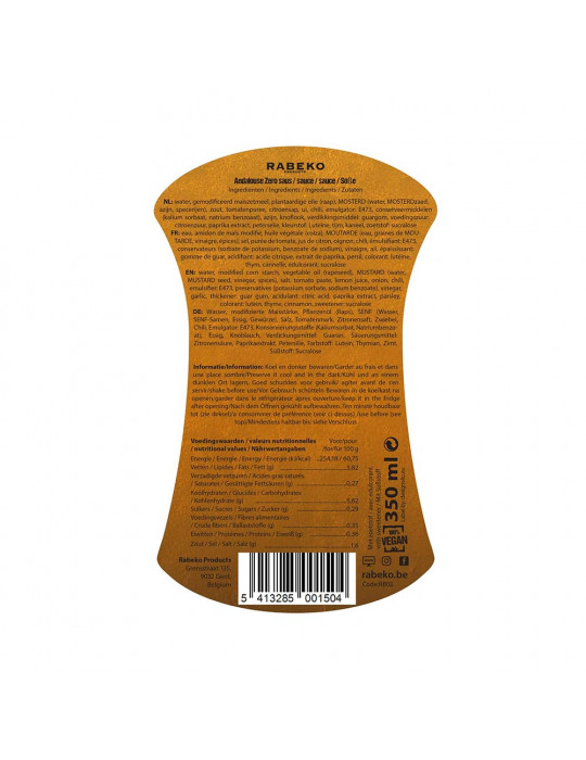 Ingrediënten AndalouseWater, gemodificeerd maïszetmeel,MOUTARDE(water, zadenMOUTARDE, azijn, kruiden), tomatenpuree, zout, citroensap, aroma, ui, Spaanse peper, azijn, plantaardige olie (koolzaad), kleurstoffen (E170, luteïne), guarpitmeel, knoflook, conserveermiddel: kaliumsorbaat,EiGeel, voedingszuur: citroenzuur, peterselie, paprika-extract, zoetstof: sucralose, tijm, kaneel.