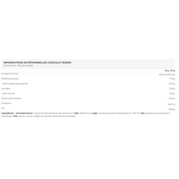 Ingrediënten - bueno chocoladeWeiproteïneconcentraat (melk) (lecithine vansoja), wei-eiwitisolaat ISO-XP (melk), gehydrolyseerd wei-eiwit (melk), aroma, magere cacaopoeder, zoetstof (sucralose).