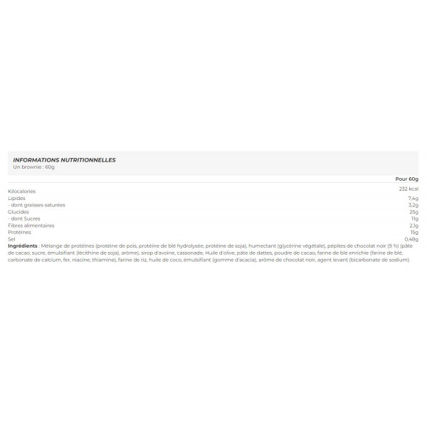 Het is rijk aan proteïne (25%), met 15g proteïne per 60g brownie.