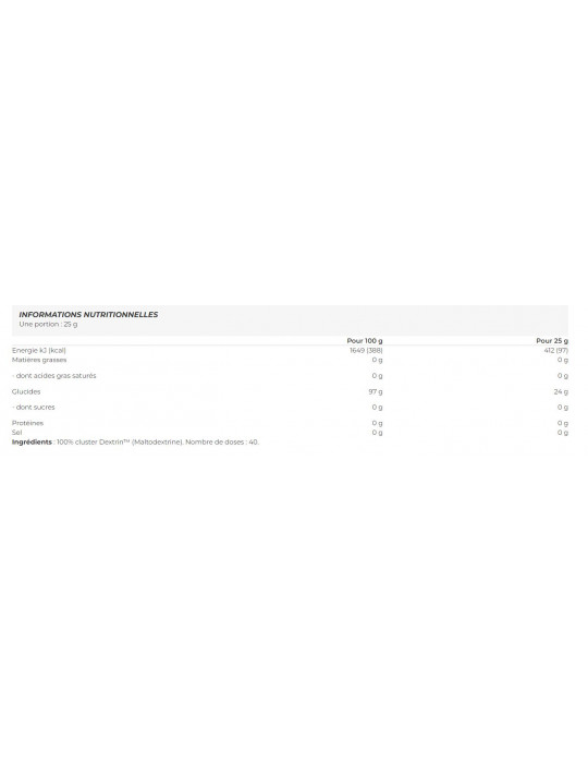 Ingrediënten: 100% cluster Dextrin™ (Maltodextrine). Aantal doses: 40.
