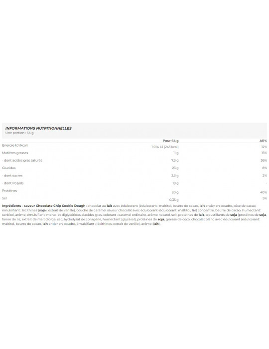Ingrediënten - Chocolate Chip Cookie Dough smaak: melkchocolade met zoetstof (zoetstof: maltitol, cacaoboter, volle melkpoeder, cacaomassa, emulgator: lecithinen(soja), vanille-extract), karamellaag met chocoladesmaak met zoetstof (zoetstof: maltitol, gecondenseerde melk, cacaoboter, bevochtigingsmiddel: sorbitol, aroma, emulgator: mono- en diglyceriden van vetzuren, kleurstof : puur karamel, natuurlijk aroma, zout), melkeiwit, sojachips (soja-eiwit, rijstmeel, gerstemoutextract, zout), collageenhydrolysaat, bevochtigingsmiddel (glycerol), soja-eiwit, kokosvet, witte chocolade met zoetstof (zoetstof: maltitol, cacaoboter, volle melkpoeder, emulgator: lecithinen, vanille-extract), aroma(melk).