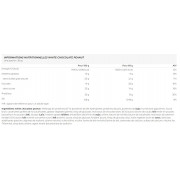 Ingrediënten witte chocolade pinda: Eiwitmengsel (27%) (gehydrolyseerd tarweproteïne, erwteneiwit, soja-eiwit), bevochtigingsmiddel (glycerine), bruine suiker, geroosterde pinda's (8%) (pinda's, plantaardig vet (palm), glucosestroop), stukjes witte chocolade (8%) (suiker, cacaoboter, volle melkpoeder, weipoeder(melk), lactose(melk), melkvet, emulgator (sojalecithine), natuurlijk vanillearoma), pindakaas, karamel fondantstukjes (5%) (suiker, gezoete gecondenseerde magere melk( mageremelk, suiker), glucosestroop, fondant (suiker, glucosestroop, water), plantaardige olie (kokos), dextrose, stabilisatoren (pectine, natriumalginaat), natuurlijk aroma), olijfolie, inuline, verrijkte tarwebloem (tarwebloem, calciumcarbonaat, calciumsulfaat, niacine, ijzer, thiamine), gouden siroop, aroma, rijsmiddel (natriumbicarbonaat).