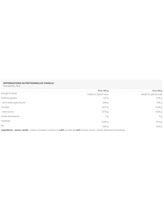 Ingrediënten - vanillesmaak : micellaire caseïne (bevat MELK), magere MELKpoeder, aroma: room, zoetstof (sucralose).