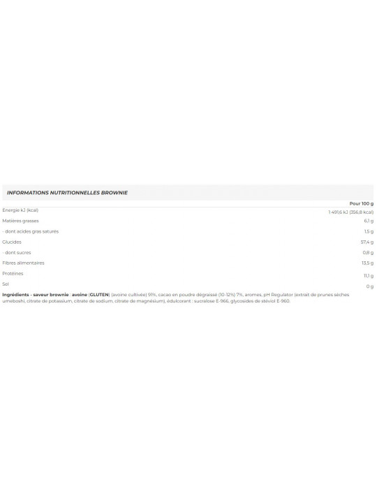 Ingrediënten - brownie smaak: haver(GLUTEN) (gekweekte haver) 91%, ontvette cacaopoeder (10-12%) 7%, aroma's, pH-regelaar (umeboshi gedroogd pruimenextract, kaliumcitraat, natriumcitraat, magnesiumcitraat), zoetstof: sucralose E-966, steviolglycosiden E-960.