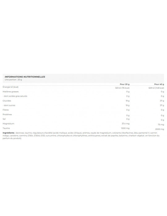 Ingrediënten: dextrose, taurine, zuurteregelaars (appelzuur, citroenzuur), aroma's, magnesiumoxide, kleurstoffen (riboflavinen, pantente blauw V, indigokarmijn, caroteen, karmijn, E150c, E150d, E133, curcumine, chlorofylen en chlorofyllijnen, anthocyanen, paprika-extract, batanine, plantaardige houtskool; afhankelijk van de smaak van het product).
