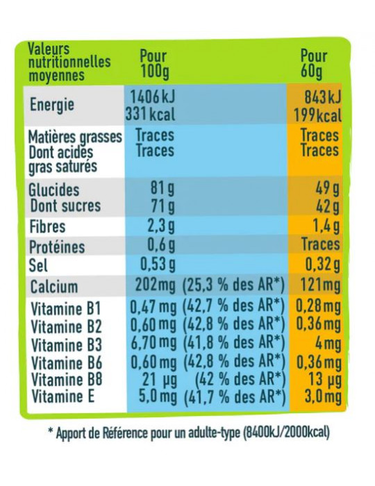 Ingrediënten - abrikozen-bananensmaak: vruchtenpuree 54% (abrikozenpuree 36%, bananenpuree 18%), glucosestroop, suiker, geleermiddel: pectine, voedingszuur: citroenzuur, tricalciumcitraat, kaliumchloride, natuurlijk abrikozenaroma, glansmiddel: carnaubawas, zonnebloemolie, vitaminen: B1, B2, B3, B6, B8, E. Tarwezetmeel.