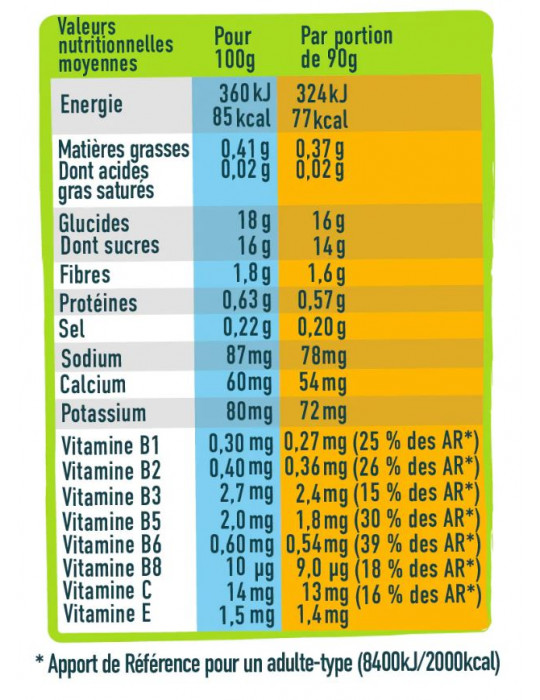 Ingrediënten - AppelbananensmaakAppels (puree en sap) 60%, bananen 35%, agavesiroop, geconcentreerd citroensap, geconcentreerd acerolasap, calciumcitraat, kaliumchloride, zout, vitaminen (B1, B2, B3, B5, B6, B8, E).