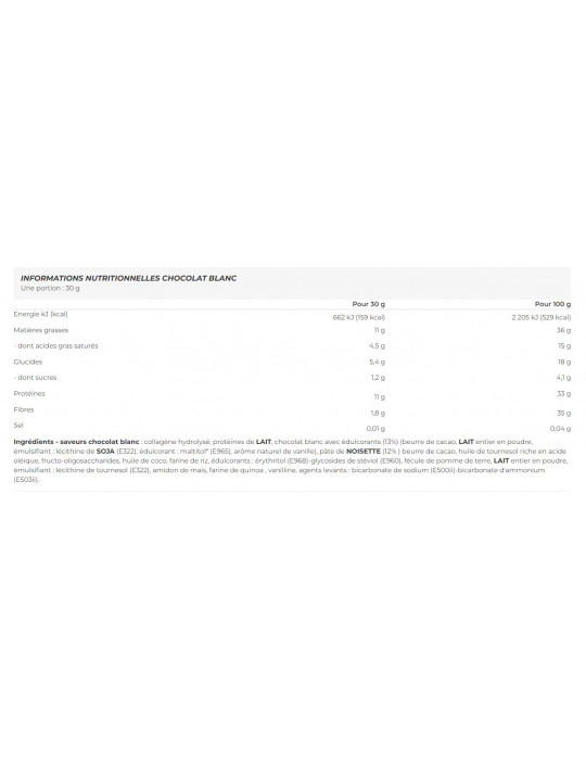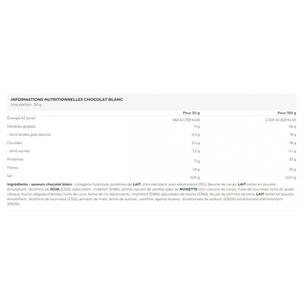 Ingrediënten - witte chocolade smaak: gehydrolyseerd collageen, MELK eiwit, witte chocolade met zoetstoffen (13%) (cacaoboter, hele MELK poeder, emulgator: SOY lecithine (E322), zoetstof : maltitol* (E965), natuurlijk vanillearoma), NOISETTE pasta (12% ) cacaoboter, zonnebloemolie met een hoog oliezuurgehalte, fructo-oligosachariden, kokosolie, rijstmeel, zoetstoffen : erythritol (E968)-steviolglycosiden (E960), aardappelzetmeel, volle melkpoeder, emulgator: zonnebloemlecithine (E322), maïszetmeel, quinoameel, vanilline, rijsmiddelen: natriumbicarbonaat (E500ii)-ammoniumbicarbonaat (E503ii).