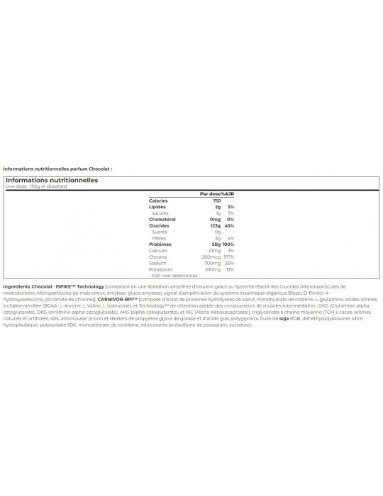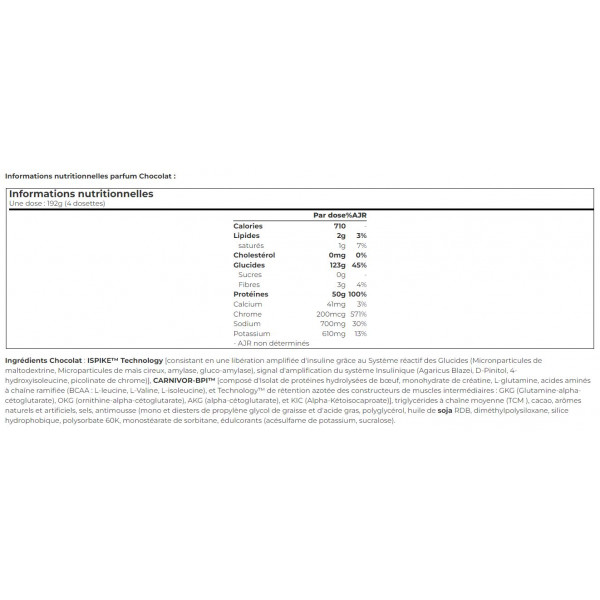 Ingrediënten voor chocolade: ISPIKE™ Technologie [consistant en une libération amplifiée d'insuline grâce au Système réactif des Glucides (Micronparticules de maltodextrine, Microparticules de maïs cireux, amylase, gluco-amylase), signal d'amplification du système Insulinique (Agaricus Blazei, D-Pinitol, 4-hydroxyisoleucine, picolinate de chrome)], , CARNIVOR-BPI™ [composé d'Isolat de protéines hydrolysées de bœuf, monohydrate de créatine, L-glutamine, acides aminés à chaîne ramifiée (BCAA : L-leucine, L-Valine, L-isoleucine), et Technology™ de rétention azotée des constructeurs de muscles intermédiaires : GKG (Glutamine-alpha-cétoglutarate), OKG (ornithine-alpha-cétoglutarate), AKG (alpha-cétoglutarate), et KIC (Alpha-Kétoisocaproate)], triglyceriden met middellange keten (MCT ), cacao, natuurlijke en kunstmatige aroma's, zouten, antischuimmiddel (mono- en diësters van propyleenglycolvet en vetzuur, polyglycerol, kokosolie) soja RDB, dimethylpolysiloxaan, hydrofoob siliciumdioxide, polysorbaat 60K, sorbitaanmonostearaat, zoetstoffen (acesulfaam kalium, sucralose).