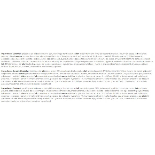 Ingrediënten Karamel eiwitten melk geconcentreerd 22%, chocoladecoating met melk met zoetstof (17%) (zoetstof: maltitol; cacaoboter), melk volkorenpoeder cacao, mager cacaopoeder, emulgator: zonnebloemlecithine; aroma), smaakstof), zoetstof: maltitol; Karamelpasta 12% [verdikkingsmiddel: polidestrosio; zoetstof: maltitol; melk geconcentreerd (melk concentraat, suiker) kokosnoot, stabilisator: glycerol; cacaoboter, emulgator: zonnebloemlecithine; zout, stabilisator: pectinen; kleurstof: eenvoudige karamel; natuurlijk aroma], 11% gehydrolyseerde collageenpeptiden, bevochtigingsmiddel: glycerol; raapzaadolie, water, eiwitkristallen van melk 3,5% (eiwit uit melk, aardappelzetmeel), verdikkingsmiddel: arabische rubber; emulgator: mono- en diglyceriden van vetzuren; zout 0,4%, conserveermiddel: kaliumsorbaat; aroma's, antioxidant: tocoferol extract.